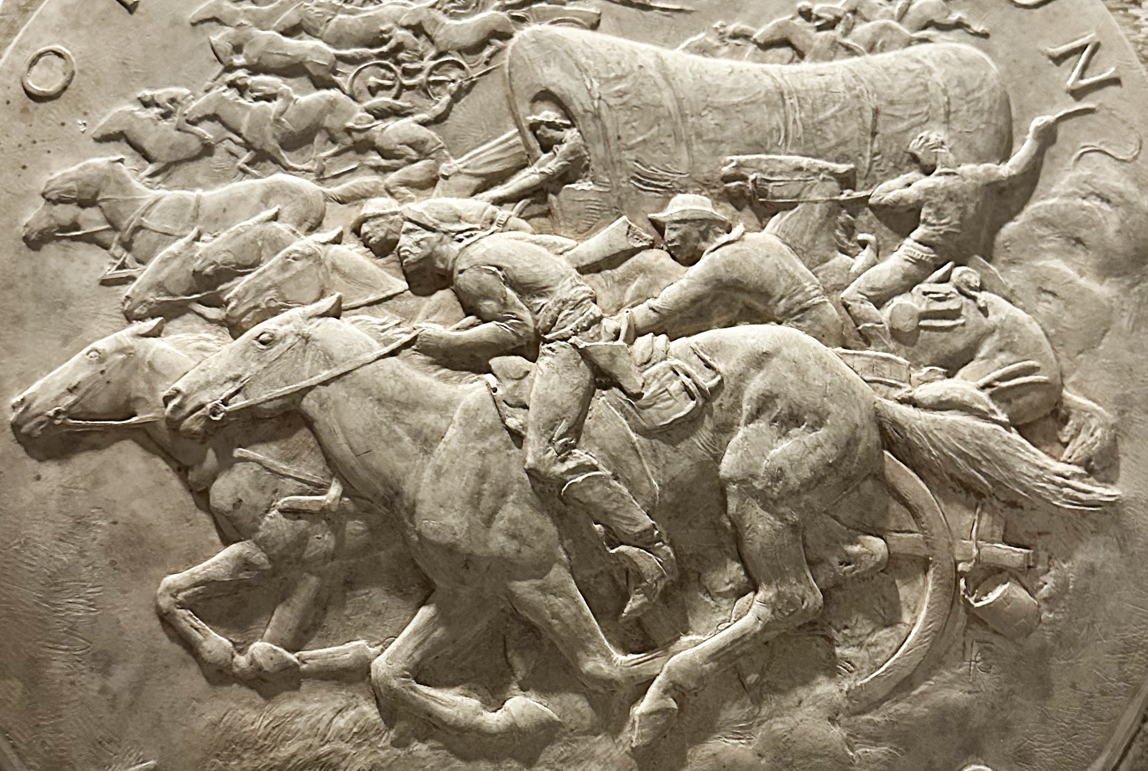 The Oklahoma City Fairgrounds commissioned James Earle Fraser to create a large, relief panel for the 1889 Land Rush. Unfortunately, he passed away and his wife, Laura, completed the design and sculpture. The panel is called Run of 1889 and is currently displayed in Oklahoma City's Bicentennial Park.